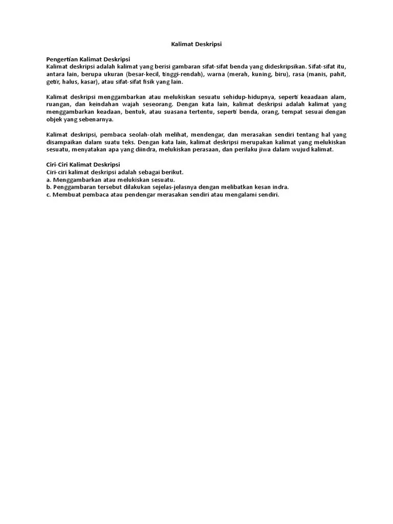 Pengertian deskripsi menjadi representasi dalam . Tapi itu hanya kelihatannya saja, sebenarnya ayah memiliki sifat yang sangat ramah, murah senyum dan tidak perhitungan. Ia selalu berbicara apa adanya walaupun hal itu buruk untuk dikatakan. Deskripsi orang adalah karangan atau laporan berdasarkan hasil pengamatan . Kakinya yang kotor berdebu itu mengapit sepasang sandal jepit.